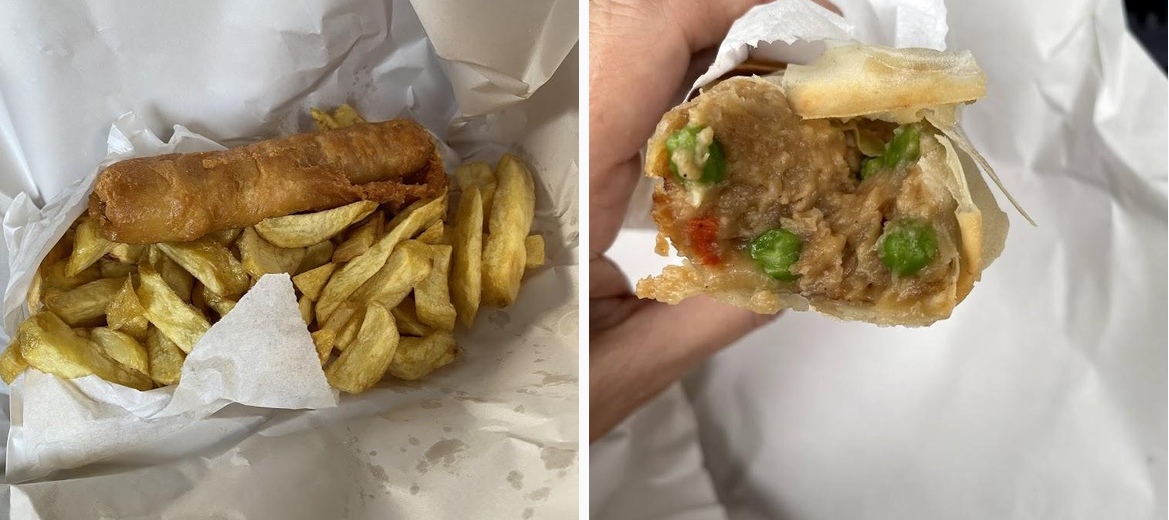 You can't go wrong with the Large Cod & Chips, a customer favorite. The battered sausage and Pukka Pies, especially the Steak & Kidney Pie, also receive rave reviews. For those with dietary restrictions, try the gluten-free options like the Battered Sausage.